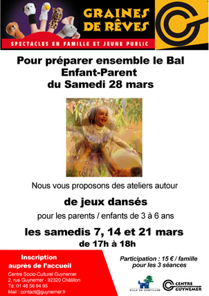Du lundi 23 au dimanche 29 mars 2015Le Centre Guynemer propose une semaine d'animation dédiée à la parentalité autour de rencontres, d'échanges et de partage. Lors de cette semaine nous vous proposons des ateliers, des spectacles, une rencontre / débat, une exposition, une après-midi jeux en famille et pour clôturer le tout un week-end festif avec un bal parent / efnfant et 2 spectacles « jeune public »